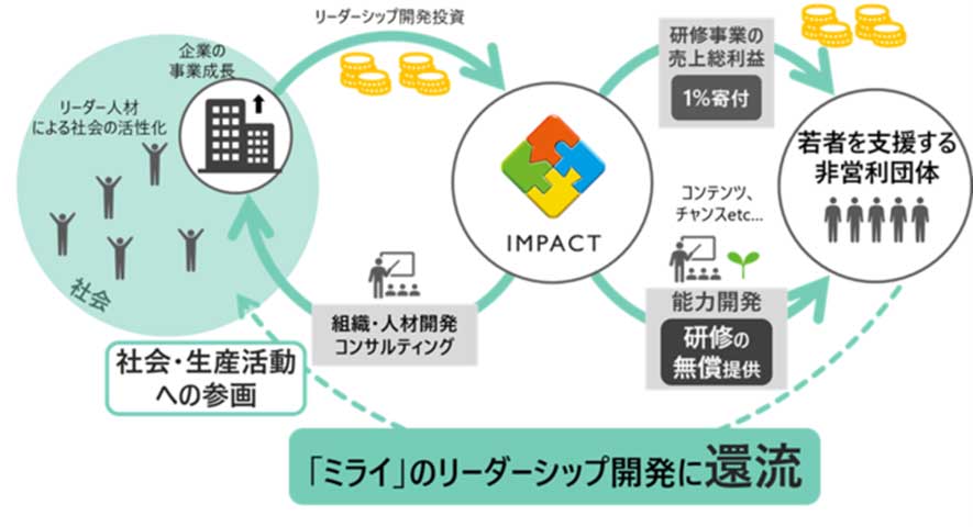 リーダーシップ・エコシステム®の原資は、クライアント企業が「自社の従業員」に対して「イマ」行っているリーダーシップ開発投資です。その一部を1)若者支援団体への寄付と、2)団体から支援を受けている生徒へのリーダーシップ開発を目的としたプロボノ研修という形で提供します。当社は事業を通じて「イマ」のリーダーシップ開発が「ミライ」のリーダーシップ開発に還流していくシステムを成立させていきます。その結果として、日本の宝である若者が、一人でも多く能力を発揮できるようになり、日本社会を活性化していく。そして取り組みが社会全体に波及し、より大きな意味でのエコシステムに発展していくことを目指します。またこの活動は「SDGs4:質の高い教育をみんなに」、「SDGs10:人や国の不平等をなくそう」そして「SDGs8:働きがいも経済成長も」の実現を目指すものです。